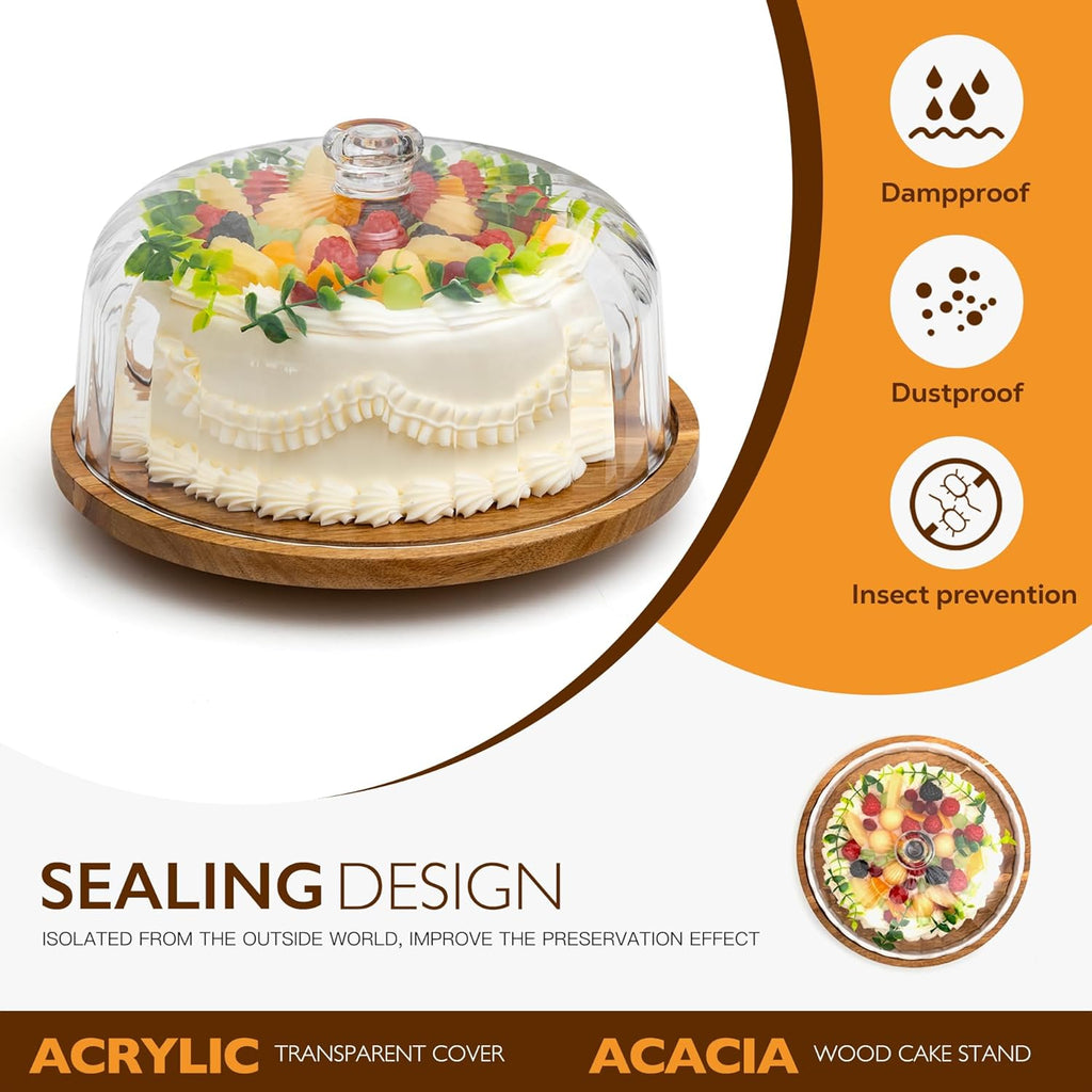 - Suporte de bolo com tampa: combinação de madeira de acácia e cobertura acrílica, bonita e generosa, bandeja giratória para melhor exibição de alimentos, adequada para casamento, reunião de família, festa de aniversário, presente de panificação.