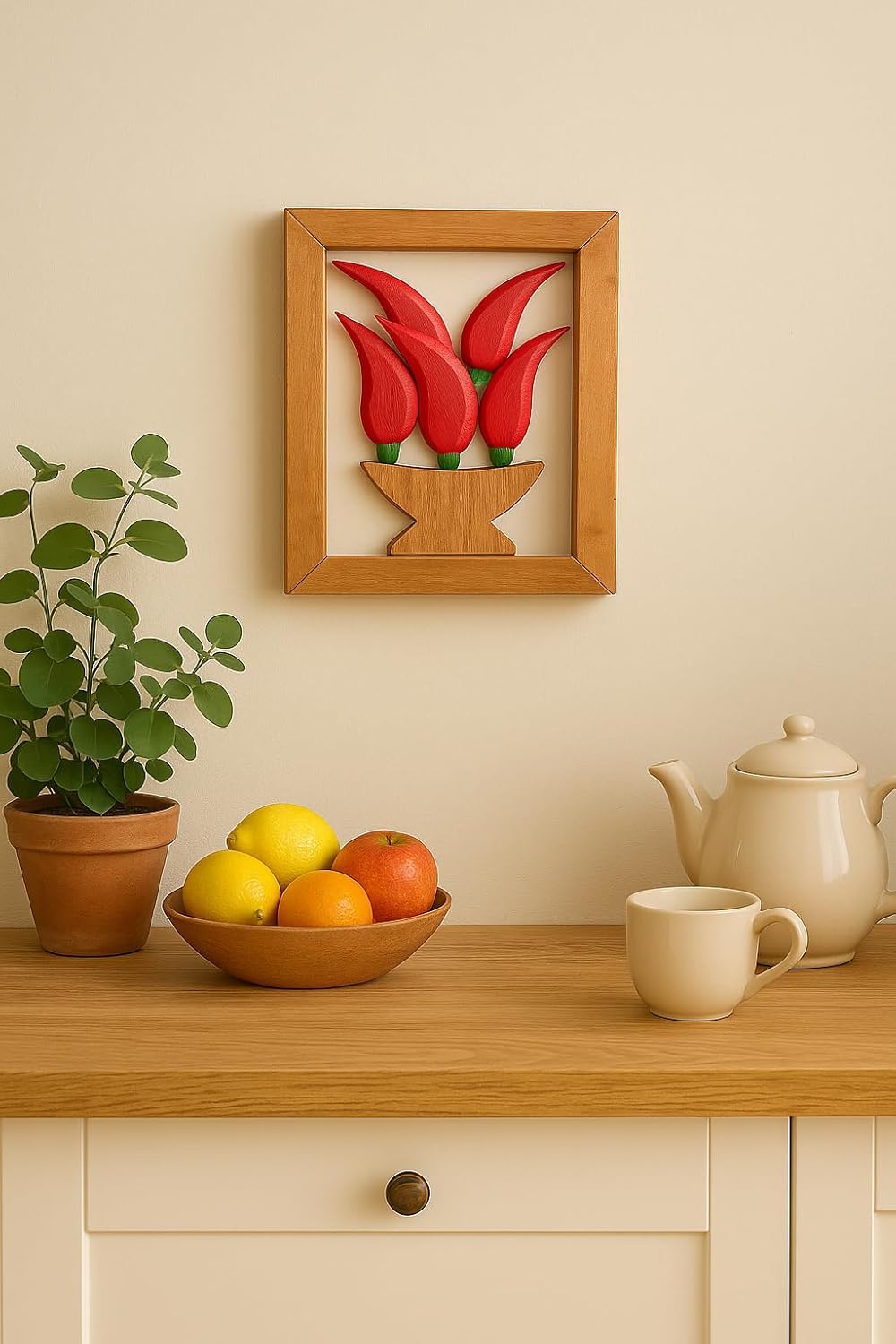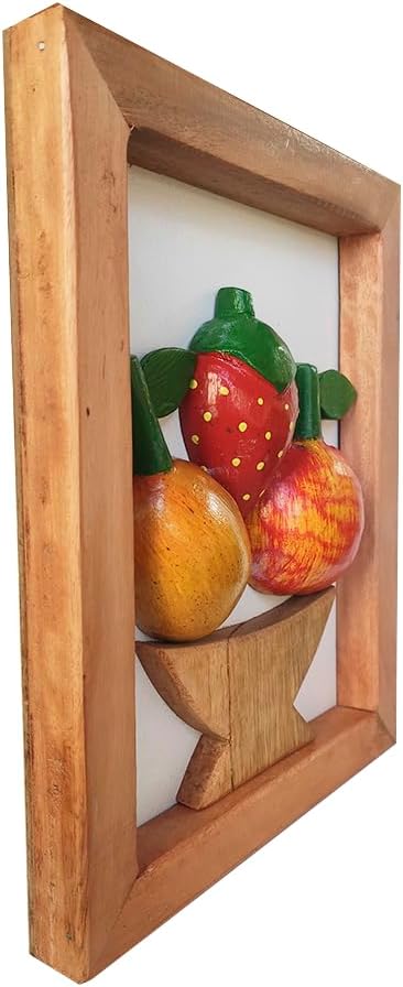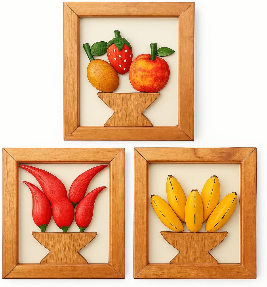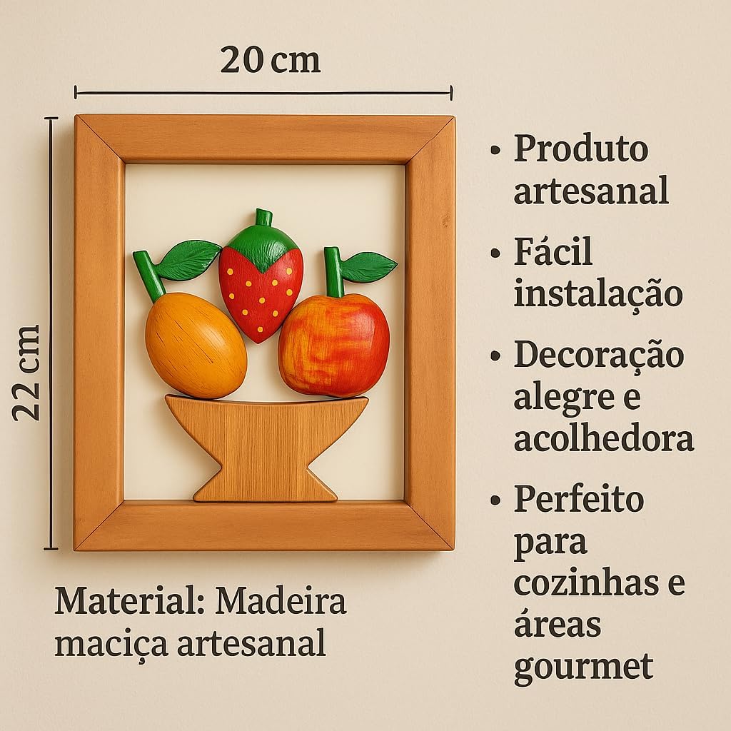 Kit com 3 quadros de parede artesanais feitos em madeira maciça, pintura artesanal e elementos decorativos de frutas, pimentas e bananas. Um conjunto charmoso que leva aconchego, cor e alegria para cozinhas, varandas e cantinhos especiais da casa. Ideal para quem valoriza a simplicidade e o carinho das casas de antigamente. Atenção: O quadro com frutas é enviado com frutas aleatórias, não sendo possível escolher o modelo. Medidas aproximadas de cada quadro: altura 24 cm, largura 20 cm, profundidade 2 cm. Peso aproximado de cada peça: 450g. Produto artesanal feito à mão, podendo apresentar pequenas variações de tonalidade da madeira e detalhes das peças decorativas, características naturais de produtos artesanais.