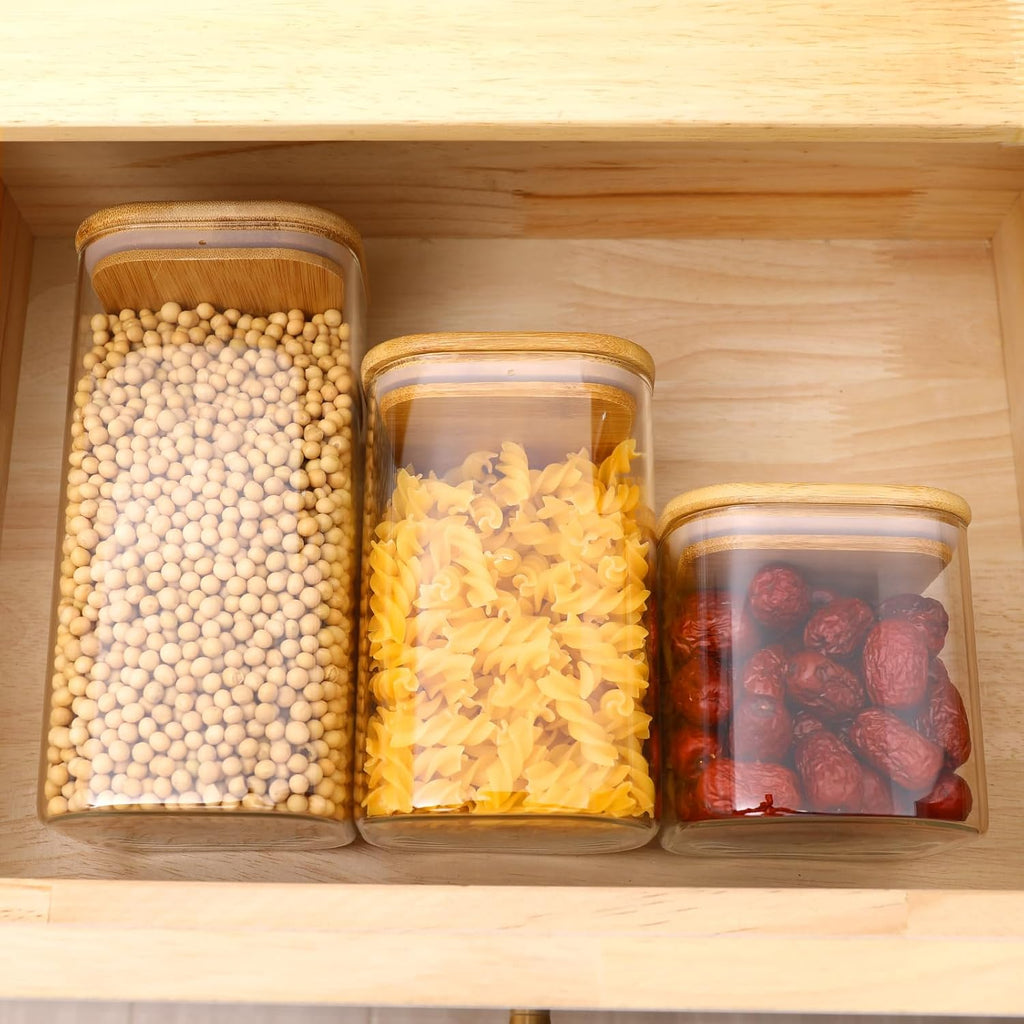 - Seguro de usar: os frascos de armazenamento de alimentos de vidro com recipientes de tampa de bambu são feitos de vidro de borossilicato de grau alimentício de 2,5 mm, mais espesso e durável do que outros conjuntos de recipientes de vidro, podem ser empilháveis quando necessário para armazenamento de economia de espaço ou alinhados em sua cozinha ou despensa, atendendo a todas as suas necessidades de armazenamento e evite a bagunça adicional do armário e 100% sem chumbo.