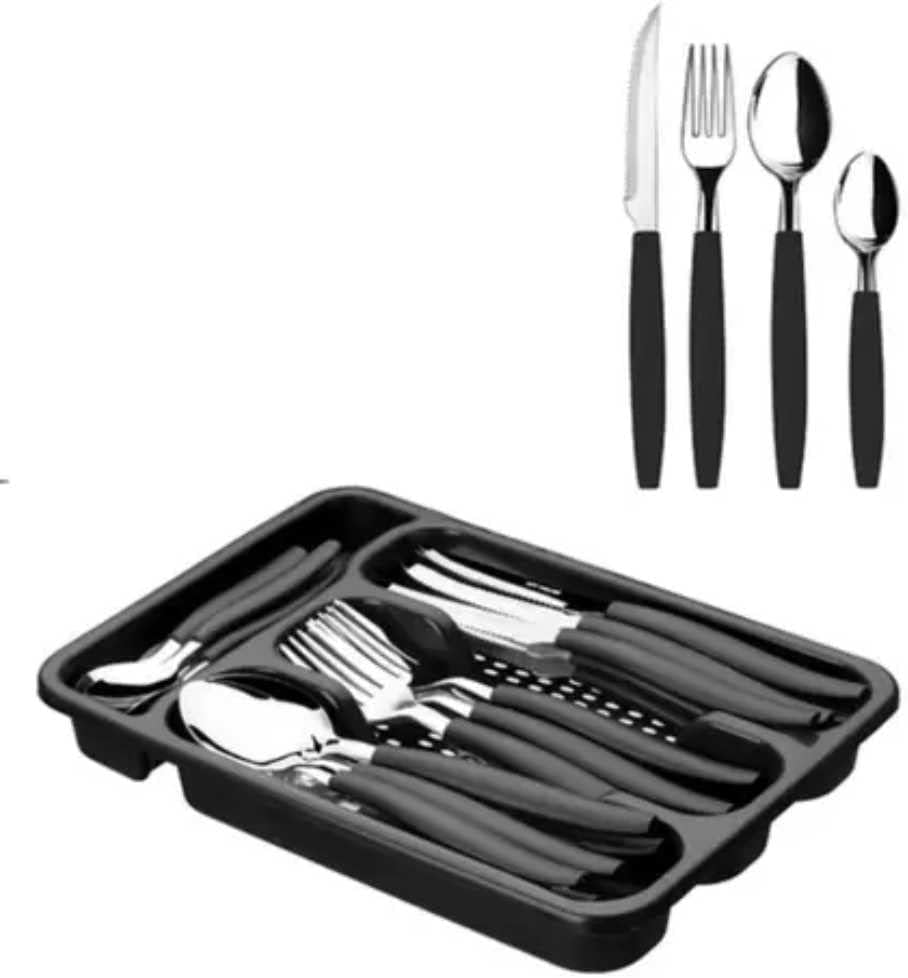 - Conjunto completo com 6 facas, 6 garfos, 6 colheres, 6 colheres de chá e porta talheres que serve como escorredor