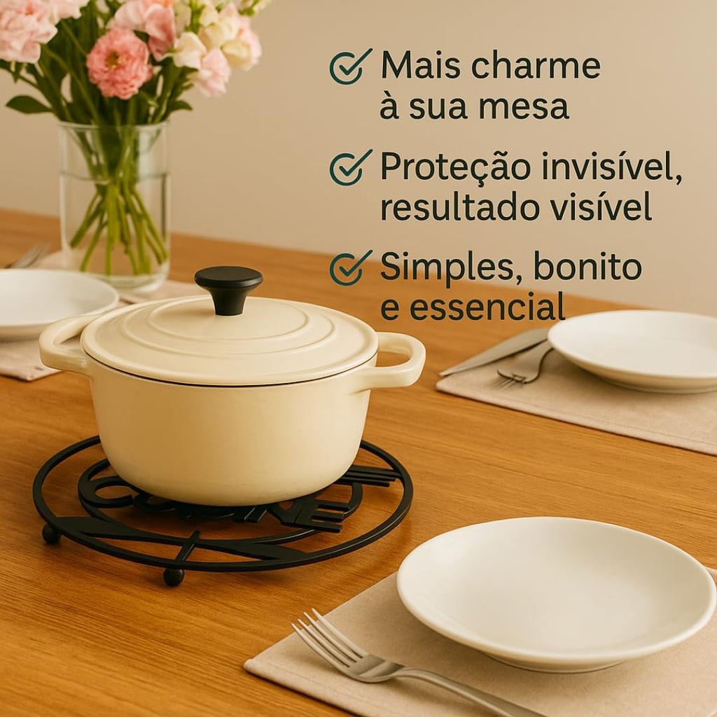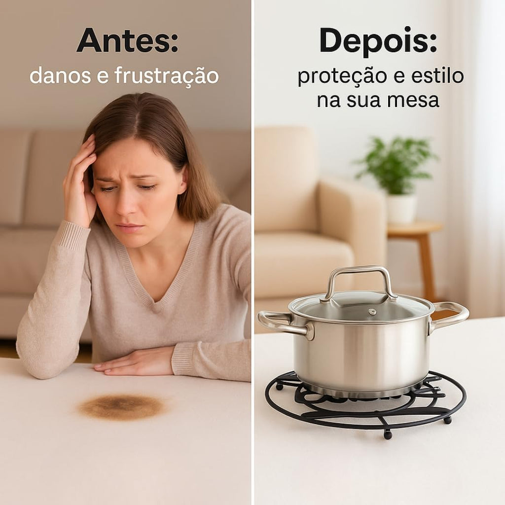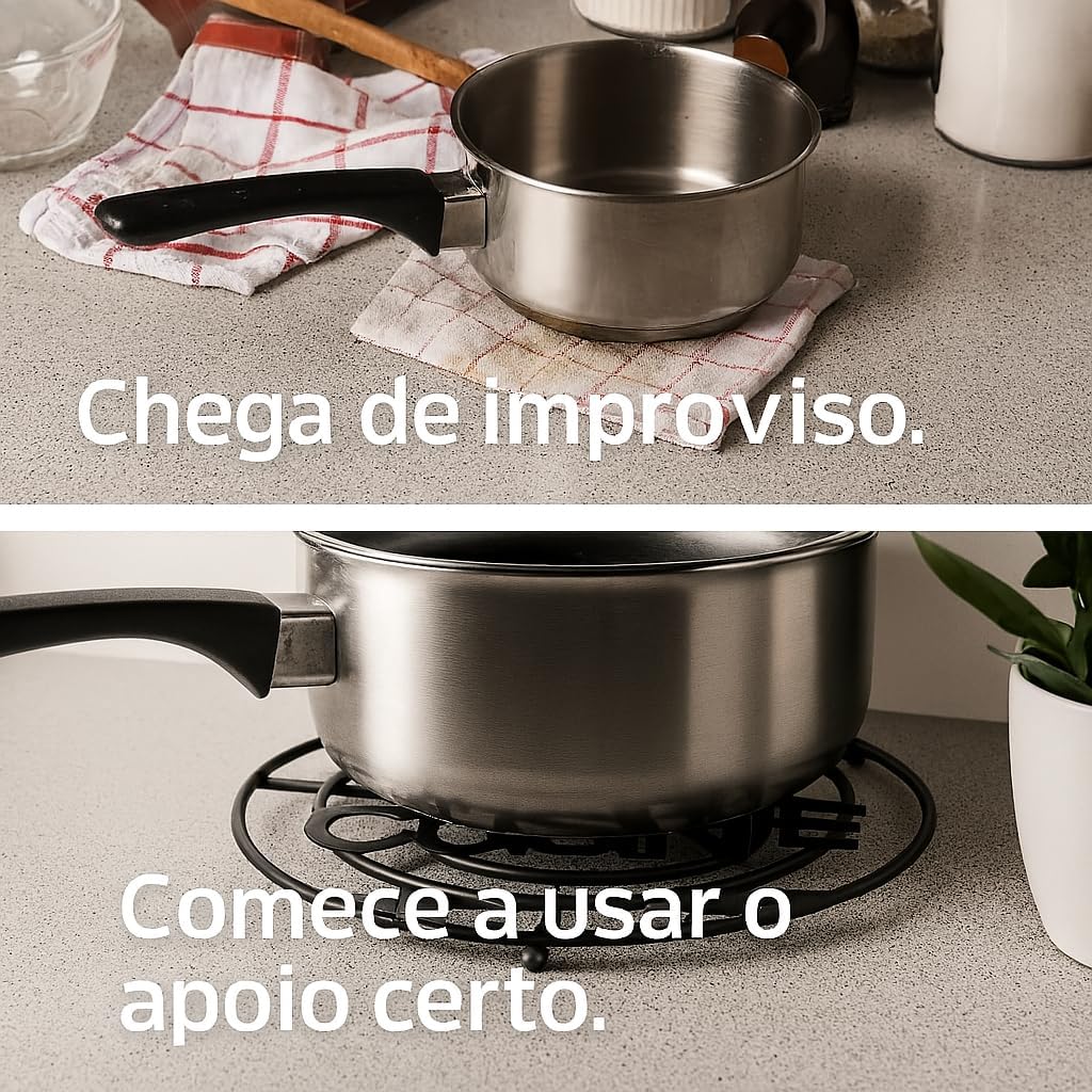 - ❓FAQ & Objeções: "E se minha panela for maior?" Ele suporta travessas até ~18 cm; "E se sujar?" Limpa facilmente com pano úmido; "É firme?" O metal estável evita tombos .