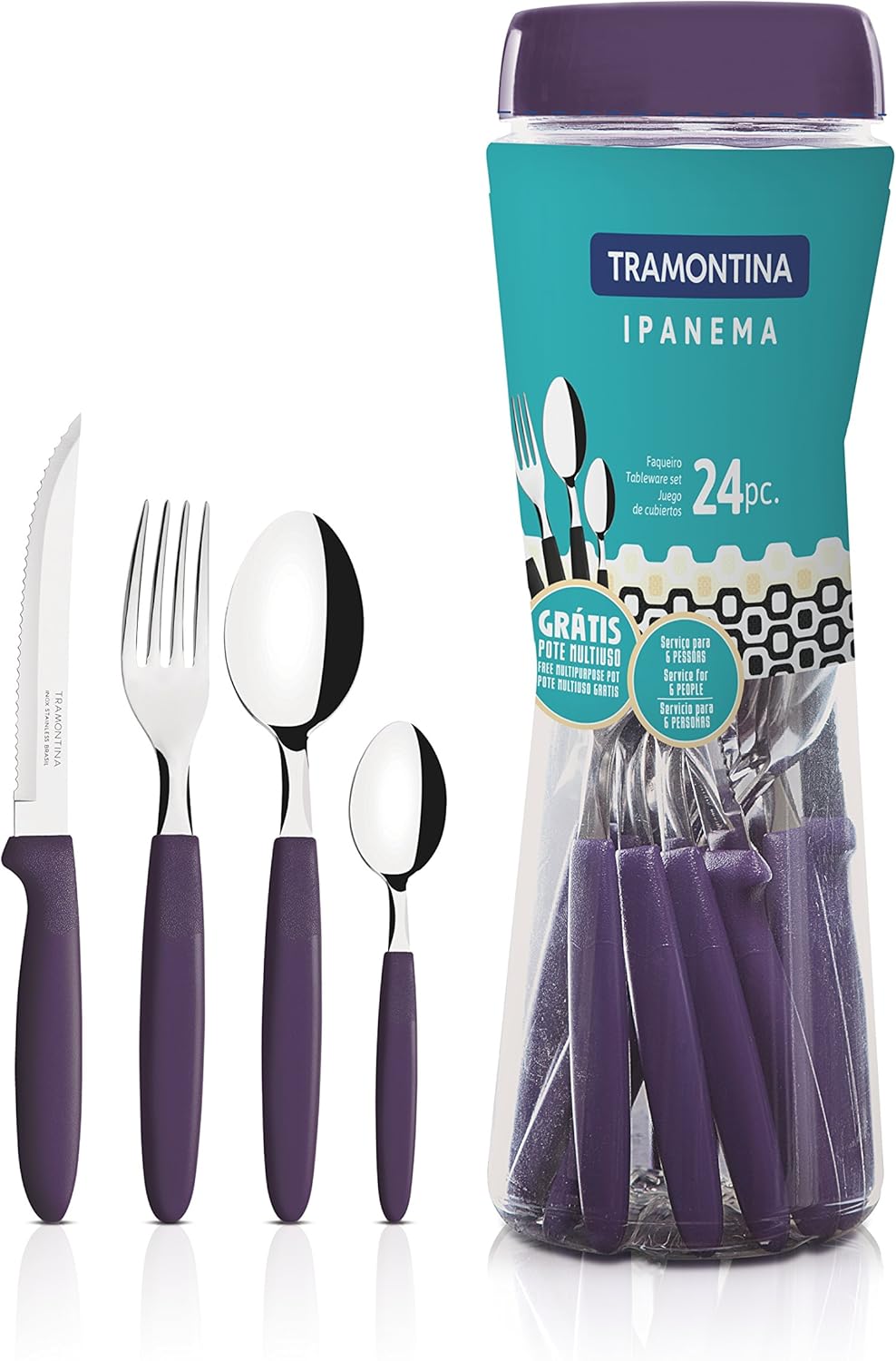 Os talheres da linha Ipanema são próprios para as refeições diárias. Despojados, têm nas diferentes opções de cores dos cabos de polipropileno o toque de alegria que vai à mesa. Os garfos, facas e colheres são de aço inox em espessuras que garantem alta resistência e durabilidade. O formato das lâminas impede deformações e o tratamento térmico dá vida longa ao fio. Podem ser levados à máquina de lavar.