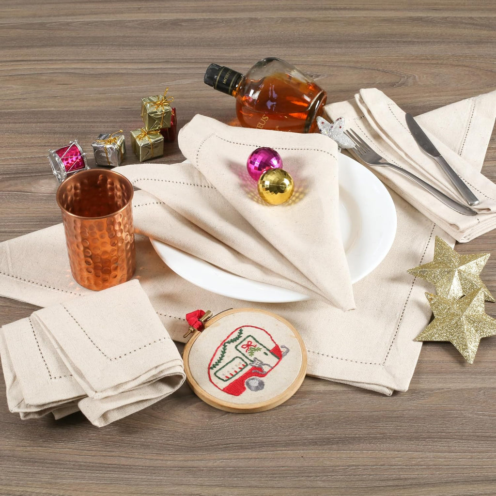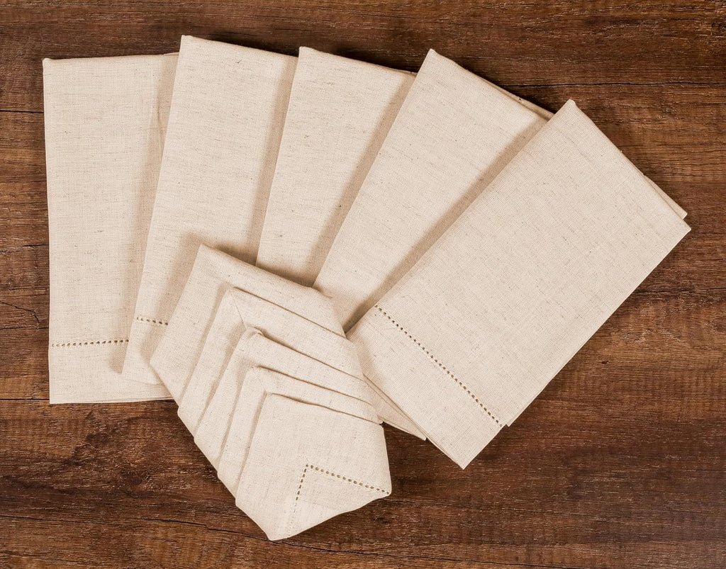 - 12 mitered corner generous hemstitched flax cotton napkins 18x18 inches. 88% Cotton 12% Linen.